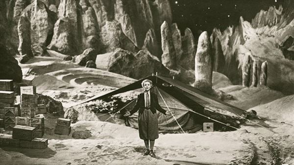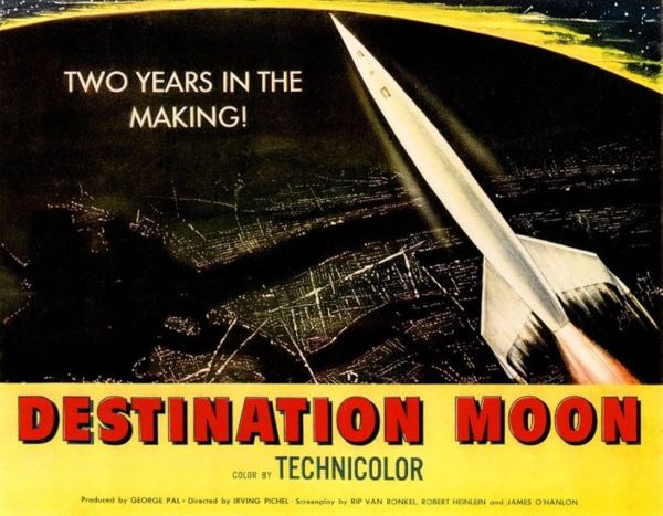 В американской картине «Место назначения — Луна» (Destination Moon, 1950) лунная тема заметно удаляется от сказочной условности ранней фантастики и впервые получает почти программно реалистическое измерение. Авторы сосредотачиваются не столько на чуде полета, сколько на его технической, организационной и цивилизационной логике: Луна предстает как достижимая цель, требующая научного знания, инженерной подготовки и политической воли. Именно здесь особенно ясно ощущается важный поворот в истории экранной Луны: она перестает быть лишь пространством приключения и превращается в образ будущего, в котором научный прогресс, государственные амбиции и идея освоения нового рубежа оказываются неразделимы.