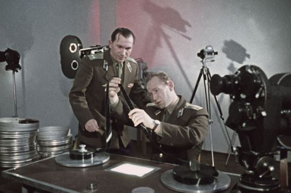 Космонавты Павел Беляев и Алексей Леонов (слева направо) работают с кинопленкой в процессе подготовки к космическому полету на корабле «Восход-2». © РИА Новости