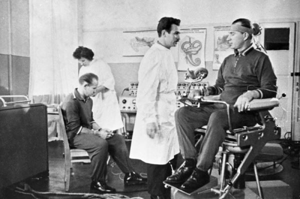 Космонавт Алексей Леонов садится в кабину центрифуги во время тренировок в Центре подготовки космонавтов. © РИА Новости