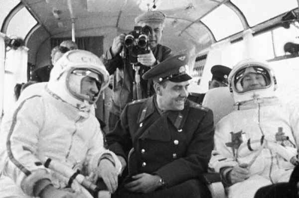 Экипаж космического корабля «Восход-2» — космонавты Павел Беляев (слева) и Алексей Леонов (справа) в сопровождении летчика-космонавта СССР Владимира Комарова направляются на стартовую площадку космического корабля. © РИА Новости