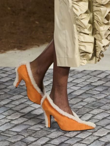 Мех, в основном искусственный превратился в маркер комфорта. Теперь его задача — не впечатлять, а согревать и создавать настроение. Gucci предлагают пушистые отделки, Moschino играют с меховыми туфлями и театральными элементами.