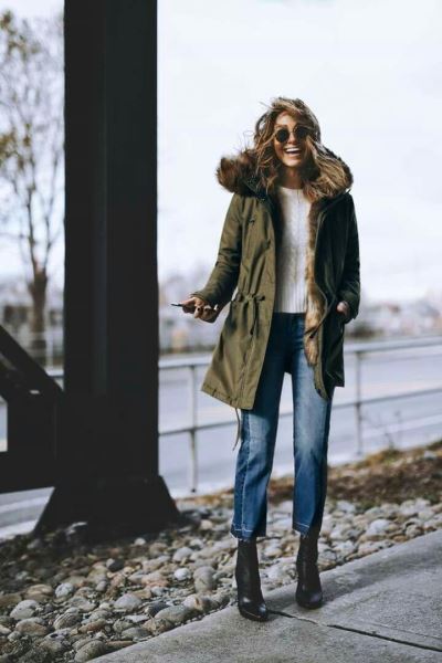 Антитренд: удлиненные парки цвета хаки с объемным мехом по краю капюшона.