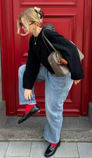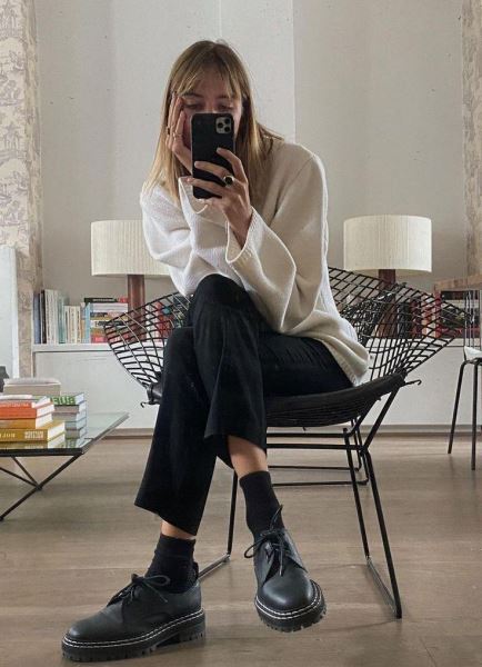 Их носят с прямыми брюками, объемными джинсами, юбками миди и легкими платьями. Это та самая обувь, которая добавляет образу интеллектуальную строгость, но не лишает его легкости.