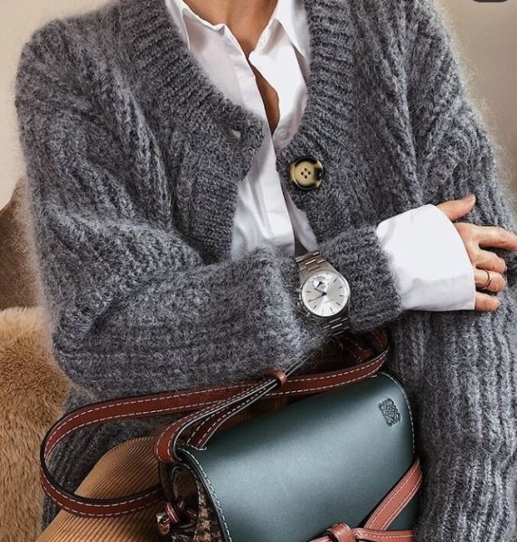 Часы с кожаным или металлическим ремешком на плотном трикотаже создают эффектный контраст текстур. Комбинация «гладкий циферблат — колючий свитер» делает аксессуар центром внимания. Не бойтесь экспериментировать с многослойностью: массивные браслеты и кольца рядом с часами добавят образу роскоши и динамики.
