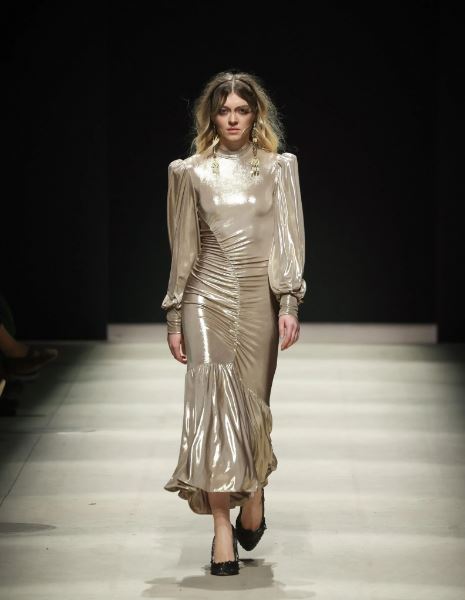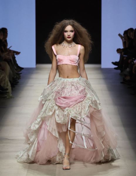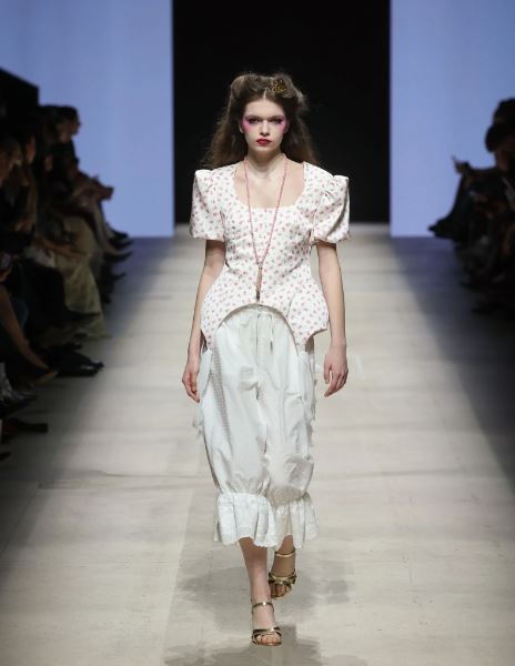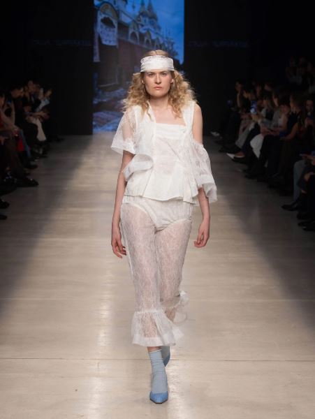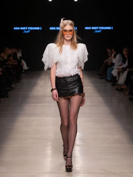 В женских коллекциях внимание привлекли пышные кринолины и панье, а петербургский бренд 404 Not Found продемонстрировал необычную стилизацию горгеры — модного в викторианскую эпоху гофрированного воротника, плотно обрамляющего шею.
