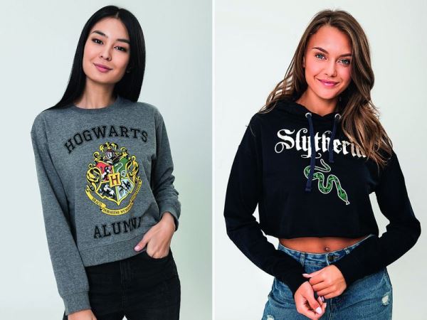 Каждая вещь украшена узнаваемыми деталями и принтами: очками, молнией, гербами факультетов, колбами с зельем и волшебными палочками.